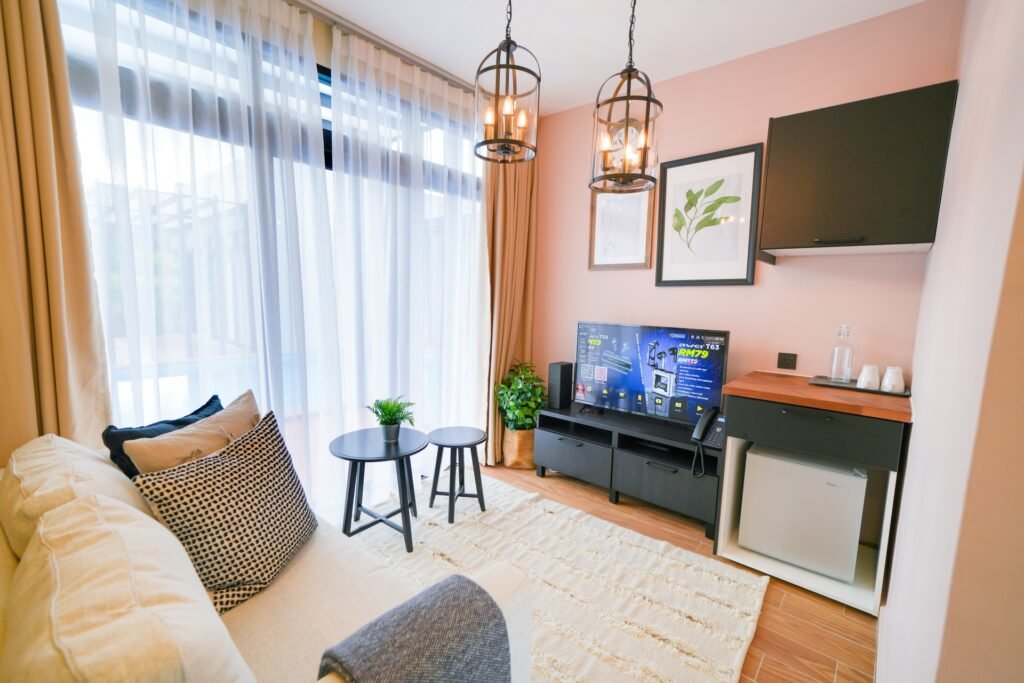 Our Hangouts Studio Suite in Bora Bora Island is the ultimate paradise. With an exquisite interior designed by IKEA Malaysia, full pantry amenities, a spacious room that can fit 4 guests, a beautiful bathroom, TV living hall, and a sofa bed that can accommodate 4 pax, you’ll feel like you’re living in a dream. And when you want to unwind, you can jump straight into the plunge pool and soak up the stunning views.